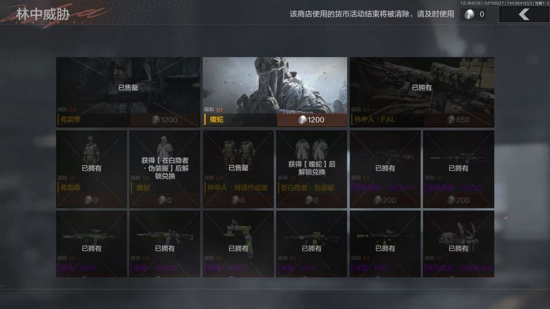 最全付费枪皮!皮肤共享!12金枪4刀13衣!玉擎天工·AN94、SOR·MK14、冰河碎影·MK14、地脉深处·FAL、林中人·FAL、竞技风潮·M4A1、苍穹利爪、下悬月、急袭弯刀、赢家匕首、弗雷德、冥河、使徒·欧瑞恩、火绒·塔莉娅、深潜行者、林中人·特遣作战服、充值过林中威胁!首领珍藏I!地脉深处!赤烬成棘!童年回忆!配件非常多!!典礼武备·MK14、包络战术·AKM、黄金H416、棱光裂变AK102、战术大师AK74N、骑士之剑·AKS74U、熔岩.AUG、告丧夜曲AR57、骑士之剑·ACE31、旗帜·AEK、典礼武备·Groza、武侍·FAMAS、V·SCAR-L、伦琴计量·T951、深潜·T03、格勒涂装AK12、旧王圣谕·QBZ191、