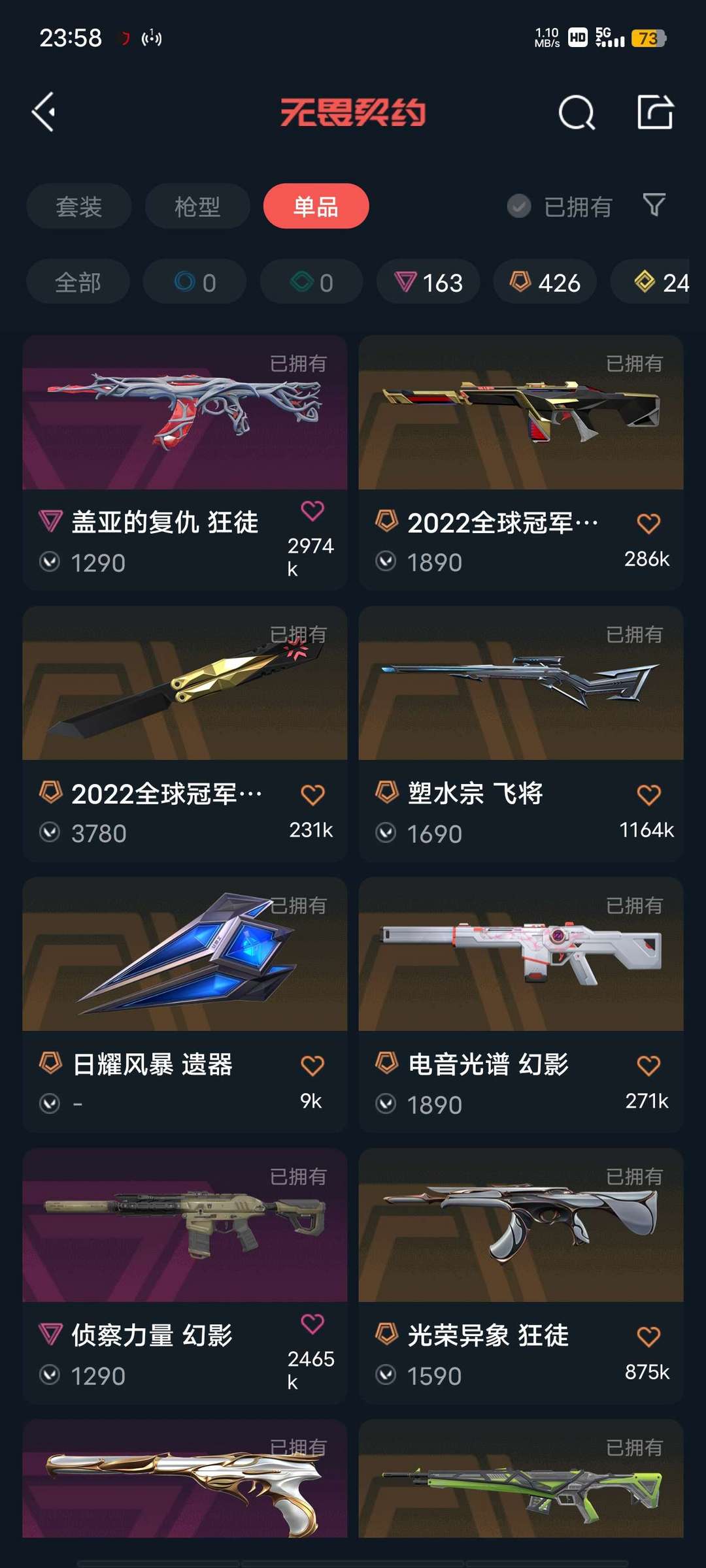 狂徒:光荣异象 塑水宗 流脓 显卡 盖亚 耀磷威龙 多弥尔 幻影:22冠军 流脓 电音光谱 侦查 莲花大狙 掠夺骇灵 鬼魅:天界 耀磷威龙 近战:22年蝴蝶刀