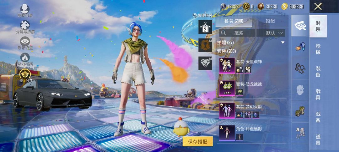 天星战神套装,火箭少女套装,恐龙拽拽套装,兰博基尼轿车皮肤,海龙奔腾蹦子皮肤,三把五级升级枪