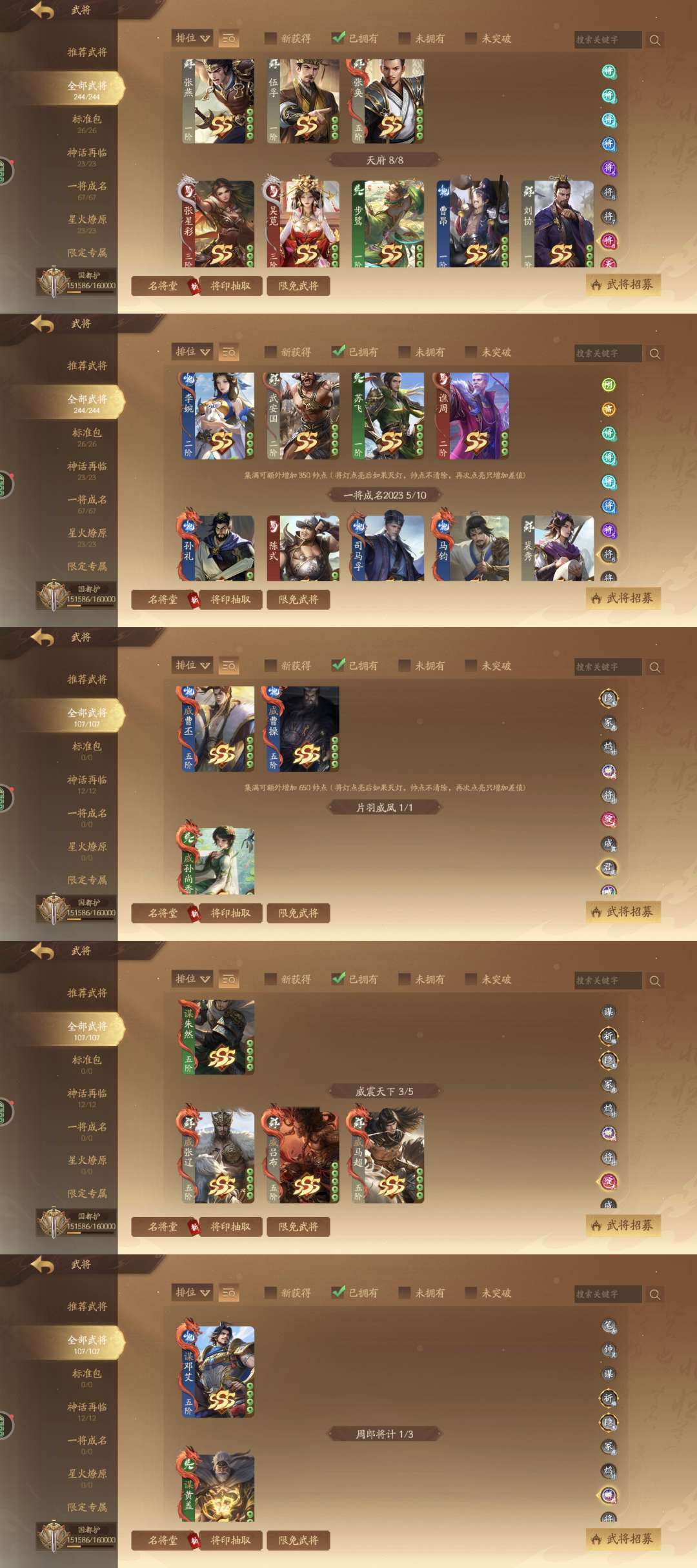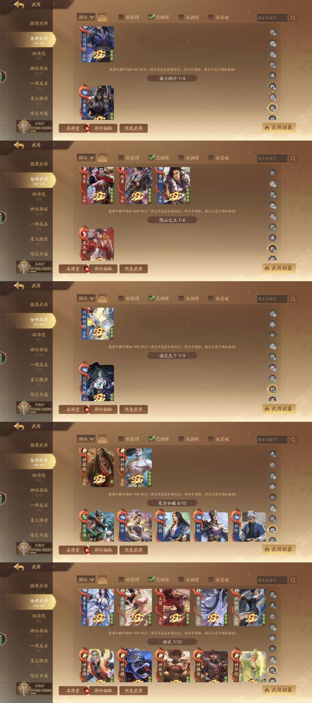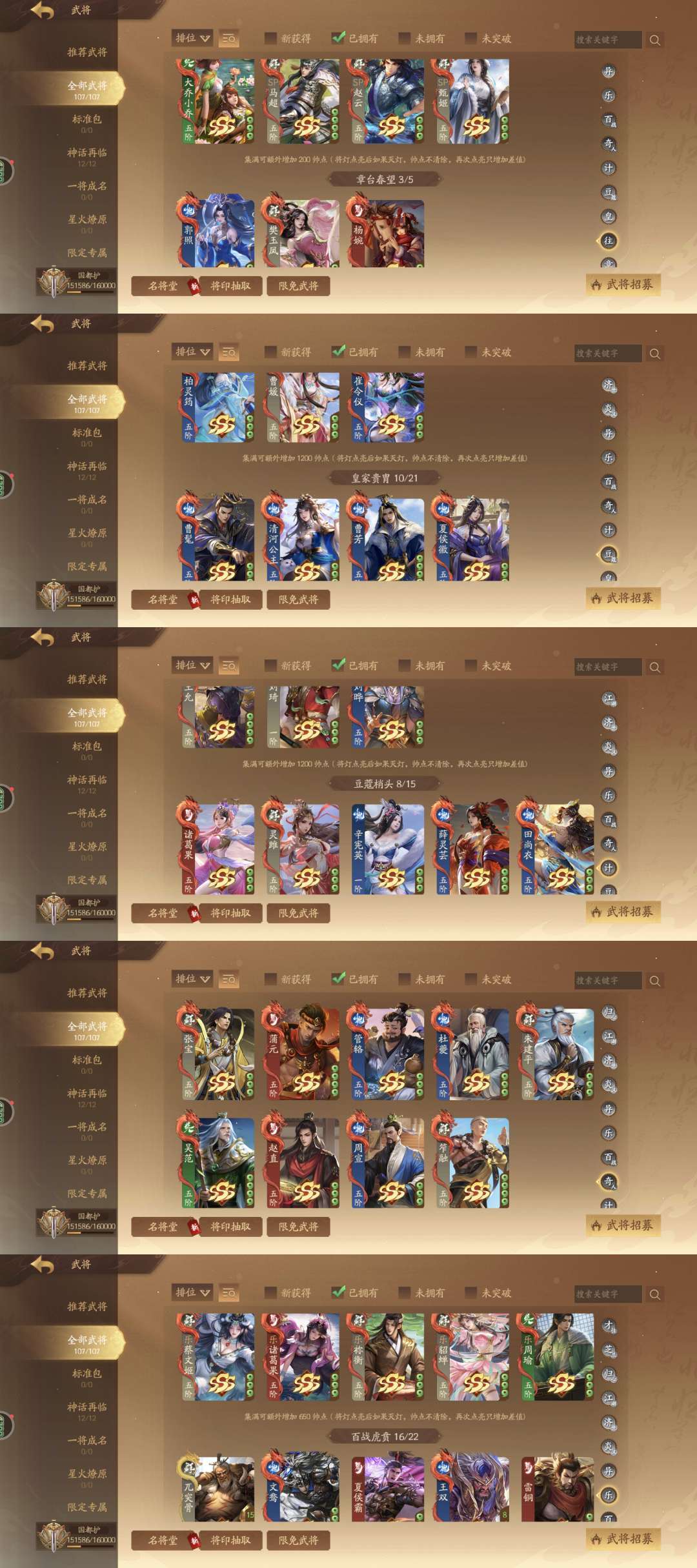 国都护,413将,227动皮,7神武,9谋1大谋,6乐限定专属:神姜维,神马超,神张飞,神庞统,神华佗,神典韦,神孙权,庞凤衣,关索,曹纯;谋定天下:谋司马懿,谋黄盖,谋司马师,谋法正,谋邓艾,谋胡烈,谋曹昂,谋骆统,谋黄权,谋曹洪;群英荟萃:钟毓,刘衿刘佩,袁胤,曹金玉,曹芳,张嫙,周宣,许劭,黄舞蝶,管宁,庞会,孙寒华,张曼成,留赞,笮融,朱建平,柏灵筠,曹媛,清河公主,夏侯徽,郭照,曹宪,蒲元,SP甄姬,乐蔡文姬,乐祢衡,乐诸葛果,乐貂蝉,乐周瑜,乐周妃,关宁,刘巴;威系列:威张辽,威吕布,威曹丕,威马超,威孙尚香,威曹操;星河璀璨:星曹仁;还有13个玉别用,等我攒个好的再给你们换,不要跑信誉分,不然永久拉黑