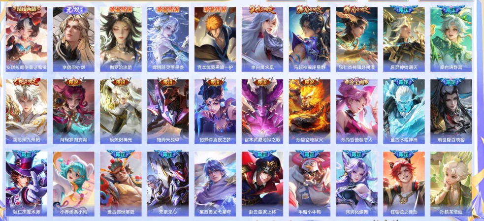 【荣耀典藏1】 安琪拉颠倒童话魔镜 【无双皮肤1】 李信问心剑 【珍品传说3】 伽罗沧流箭 嫦娥器灵落星盏 宫本武藏黑崎一护 【限定传说6】 李白凤求凰 马超神骥逐星野 狄仁杰神骥赴朔漠 后羿神树通天 桑启鸣野蒿 澜愿照九州拓 【传说皮肤12】 阿轲罗刹妄海 李白凤求凰 马超神骥逐星野 镜炽阳神光 狄仁杰神骥赴朔漠 铠绛天战甲 貂蝉仲夏夜之梦 宫本武藏地狱之眼 孙悟空地狱火 后羿神树通天 桑启鸣野蒿 澜愿照九州拓 【年限皮肤4】 李白凤求凰 马超神骥逐星野 狄仁杰神骥赴朔漠 澜愿照九州拓 【珍宝阁皮肤1】 孙尚香蔷薇恋人