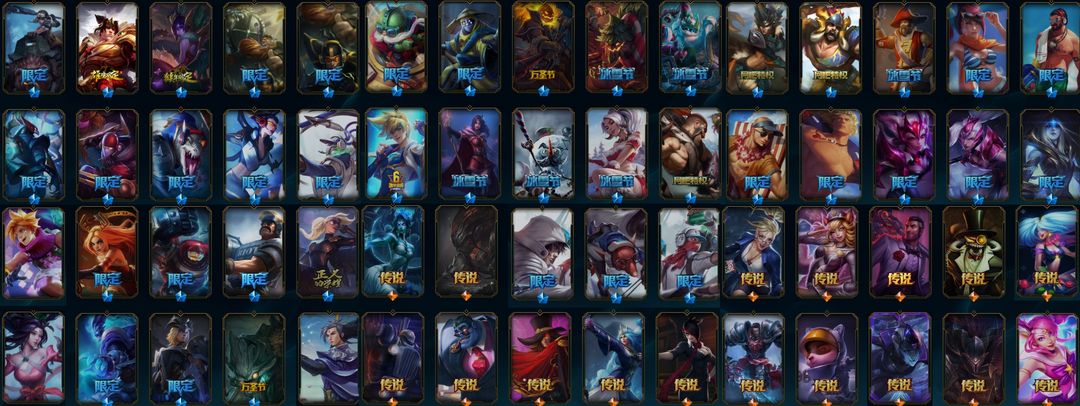 龙瞎/海克斯鳄鱼/元素使/木兰/春晖/南天/北辰/罗刹/张辽/虎痴/吕布/貂蝉/战熊/金猪薇恩/羊年萝莉/蛇年蛇/电玩女枪瑞雯阿狸伊泽/周年伊泽/御星艾希/创星璐璐/情人节娑娜/冠军锤石龙女/未来伊泽/防爆机器/鬼魂新娘/偶像阿狸/擎天柱/玉剑剑圣风女/源计划艾希薇恩/女校长/女主播/黑夜亚索/律政蒙多/
