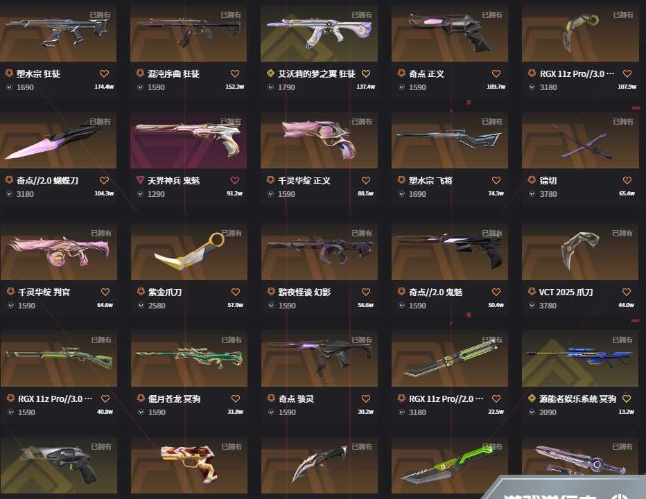【当前段位:铂金II】❤可排❤14万库❤多弥尔套❤25冠军套❤西部套❤vct爪剥皮花蝴蝶黑波流风回雪莲花2.0狂徒特效看图