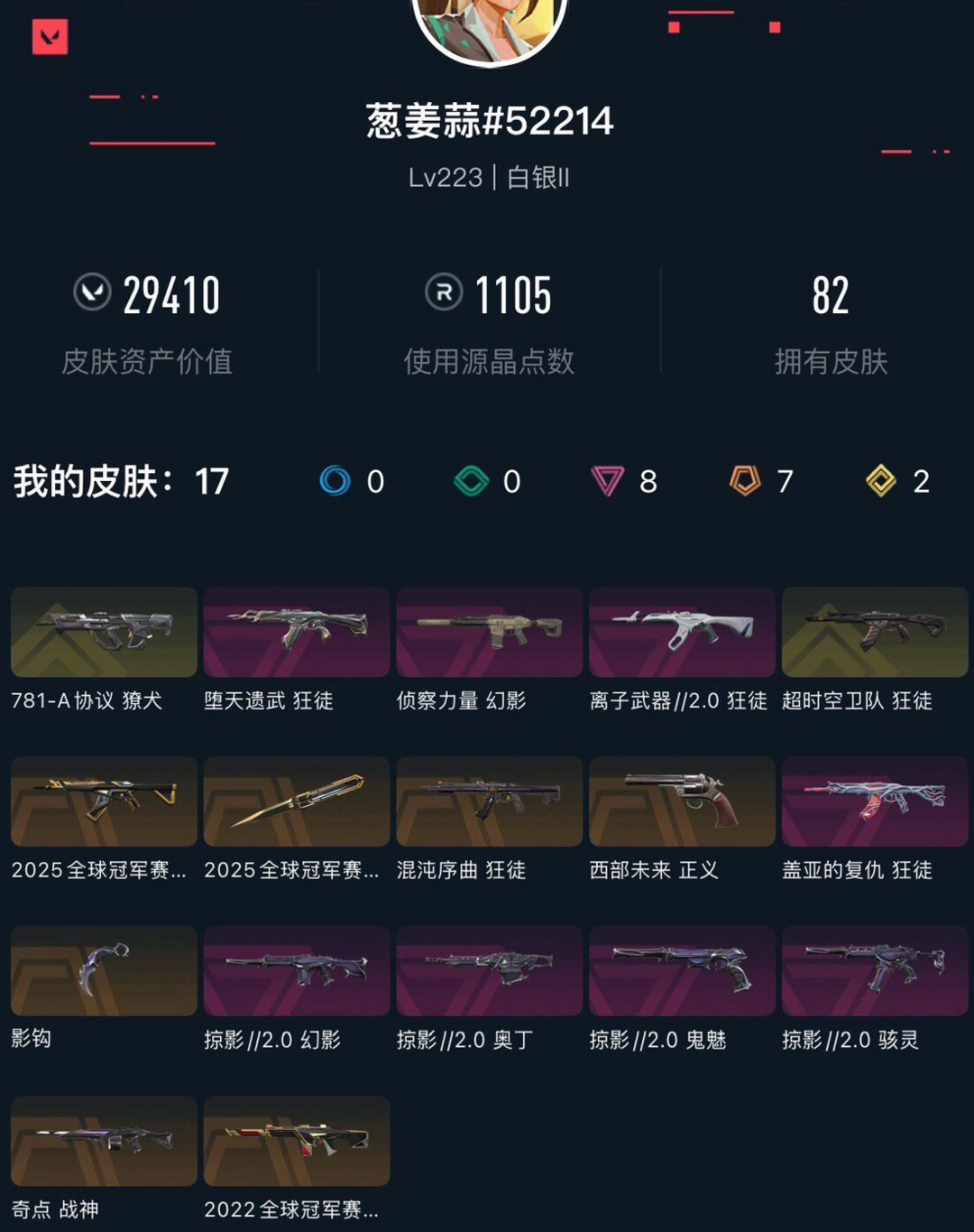 【黄金I】可排位⭐VCT2025爪刀⭐混沌狂徒⭐塑水狂徒⭐创纪元狂徒⭐奇点正义⭐千灵华绽幻影⭐千灵华绽冥驹判官