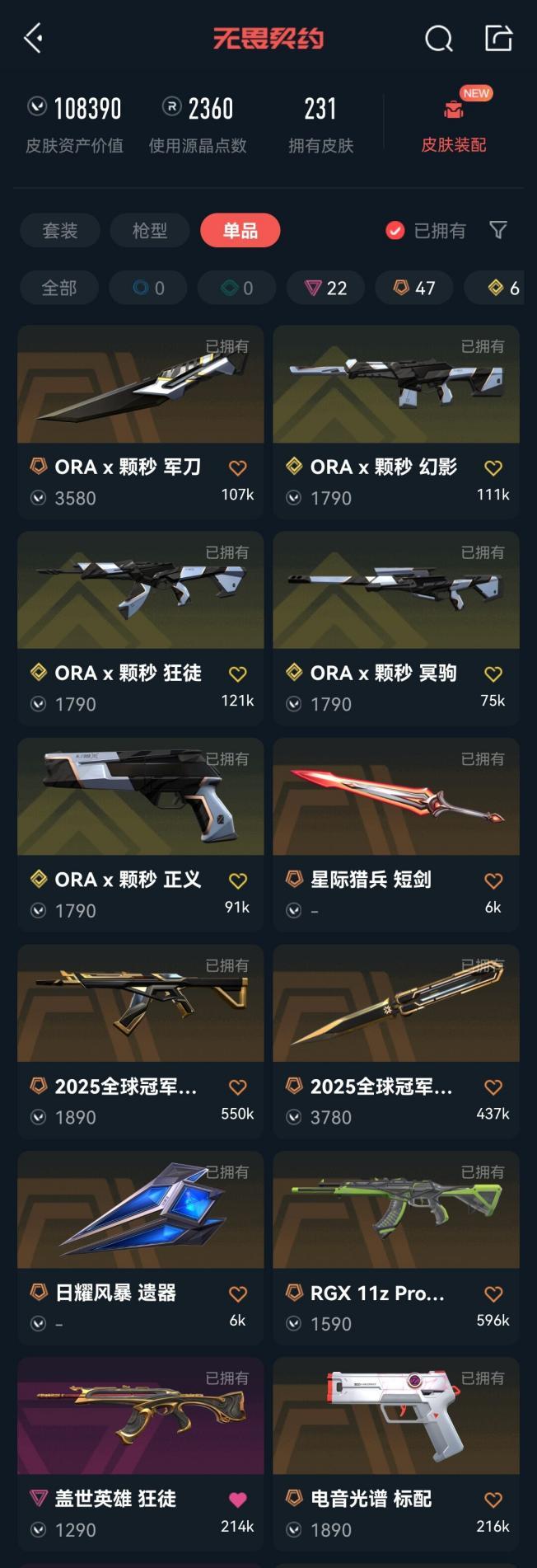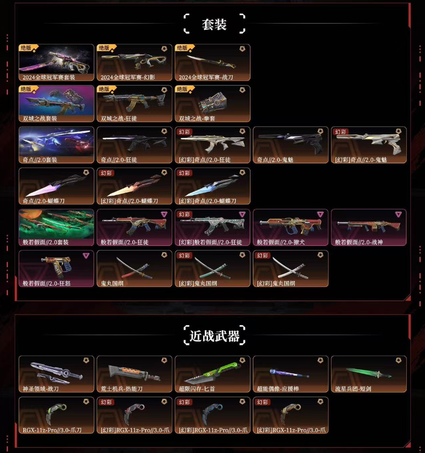 【当前段位:铂金I】25冠军套♥创纪元套♥西部未来套♥魔蛇套♥VCT爪刀♥堕天遗武♥猴子狂徒♥紫金掠影狂徒♥起源大狙