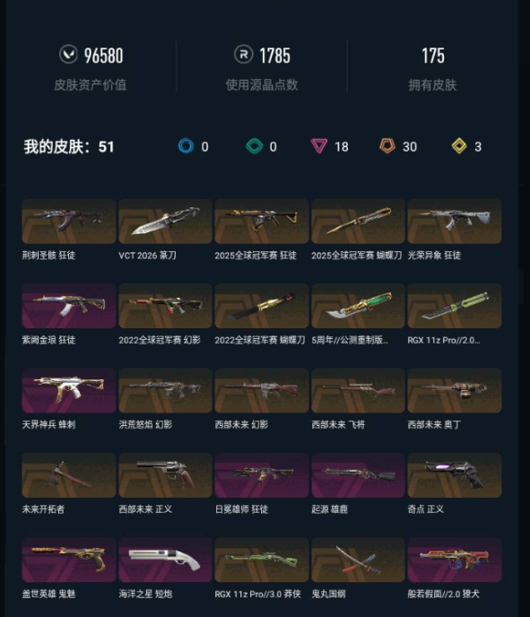 【黄金II】可排✅25冠军⭐掠夺爪刀显卡爪穿花蝴蝶⭐紫金掠夺猴子狂徒⭐离子弃王归零者冥狙⭐天界飞将⭐VCT标配
