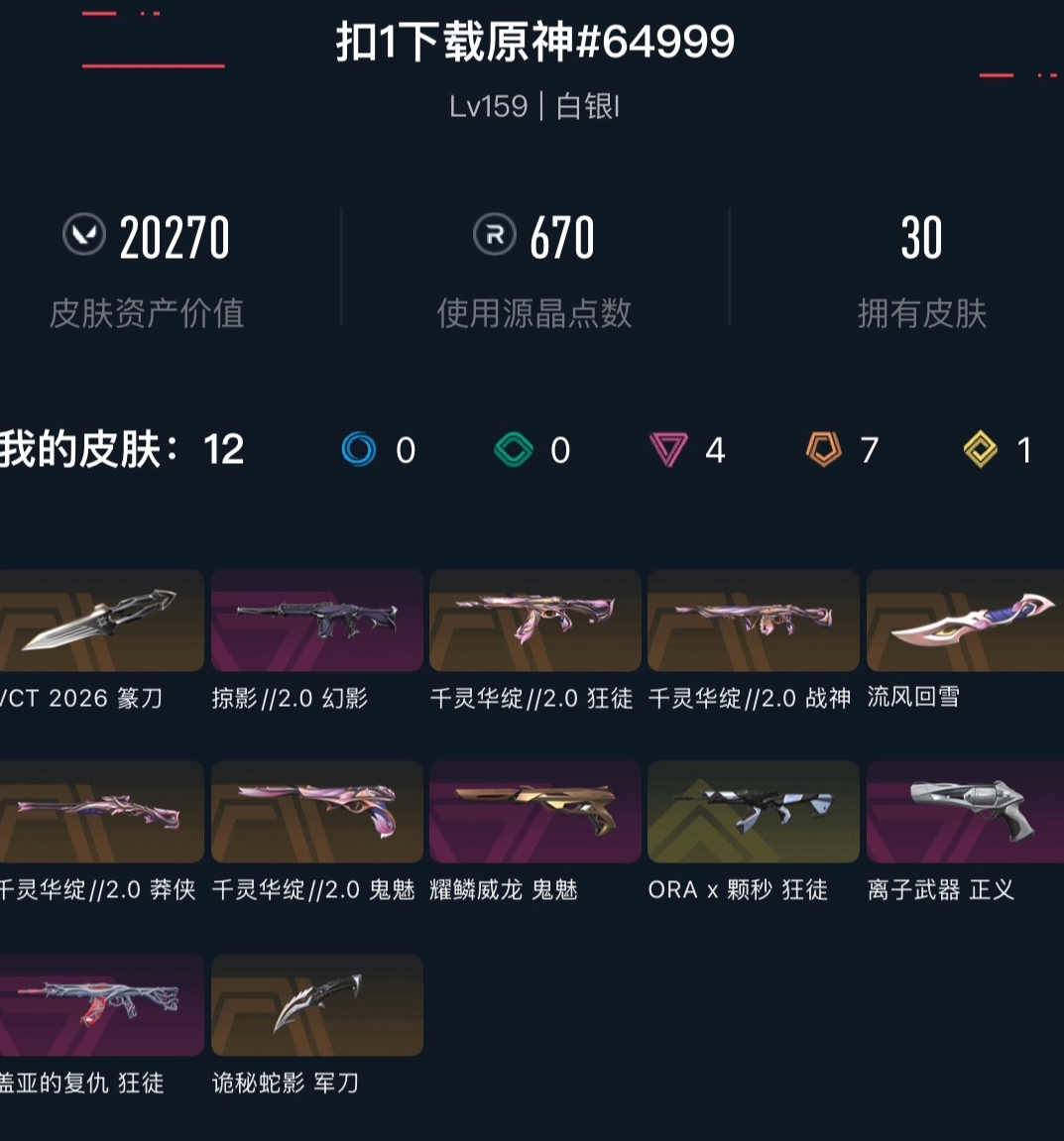 【铂金II】可排位1200R⚡VCT26篆刀+黑波之刃⚡22/25冠军⚡显卡+猫猫+掠夺AK⚡颗秒正义⚡显卡莽侠