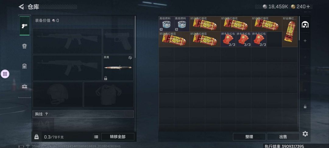 猛攻开黑体力0/负重0/红狼-蚀金玫瑰/红狼-电锯惊魂/黑鹰/典藏外观0/武器外观数0