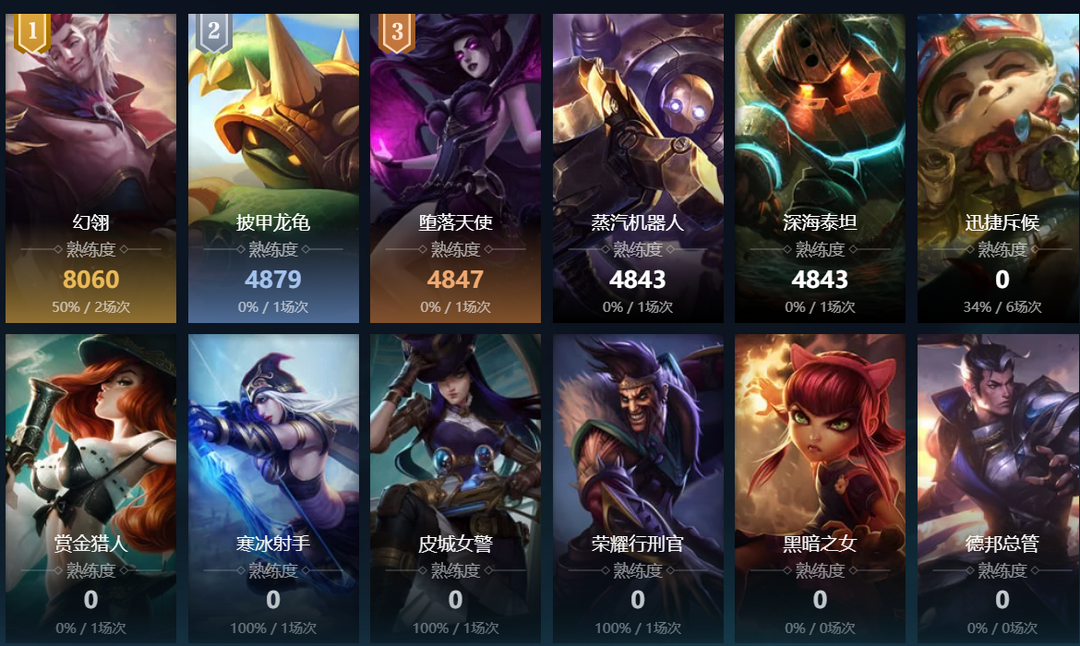 魔法猫咪;光辉女郎;寒冰射手;赏金猎人;潮汐海灵;熔岩巨兽;黑暗之女;正义巨像;德邦总管;远古恐惧;