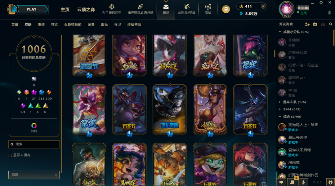 130p。各种年定皮肤加限定传说。皮肤满配