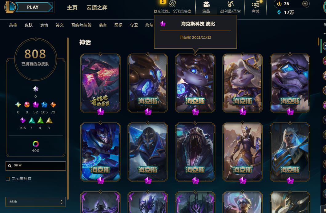 低段位可虐菜(全英雄 30个神话皮肤✨ 56个限定皮肤✨ 60个传说皮肤✨ 一共有441个皮肤)