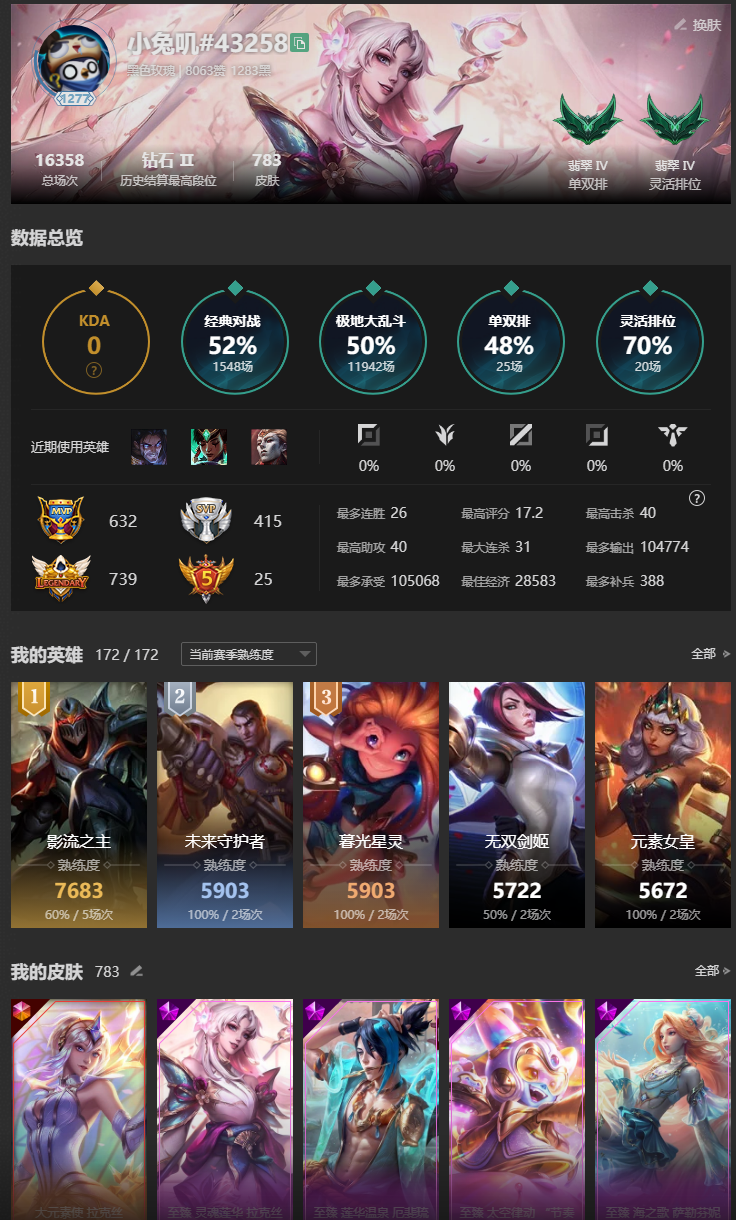 黑色玫瑰,400皮肤(166英雄)限定(99) 传说43史诗26