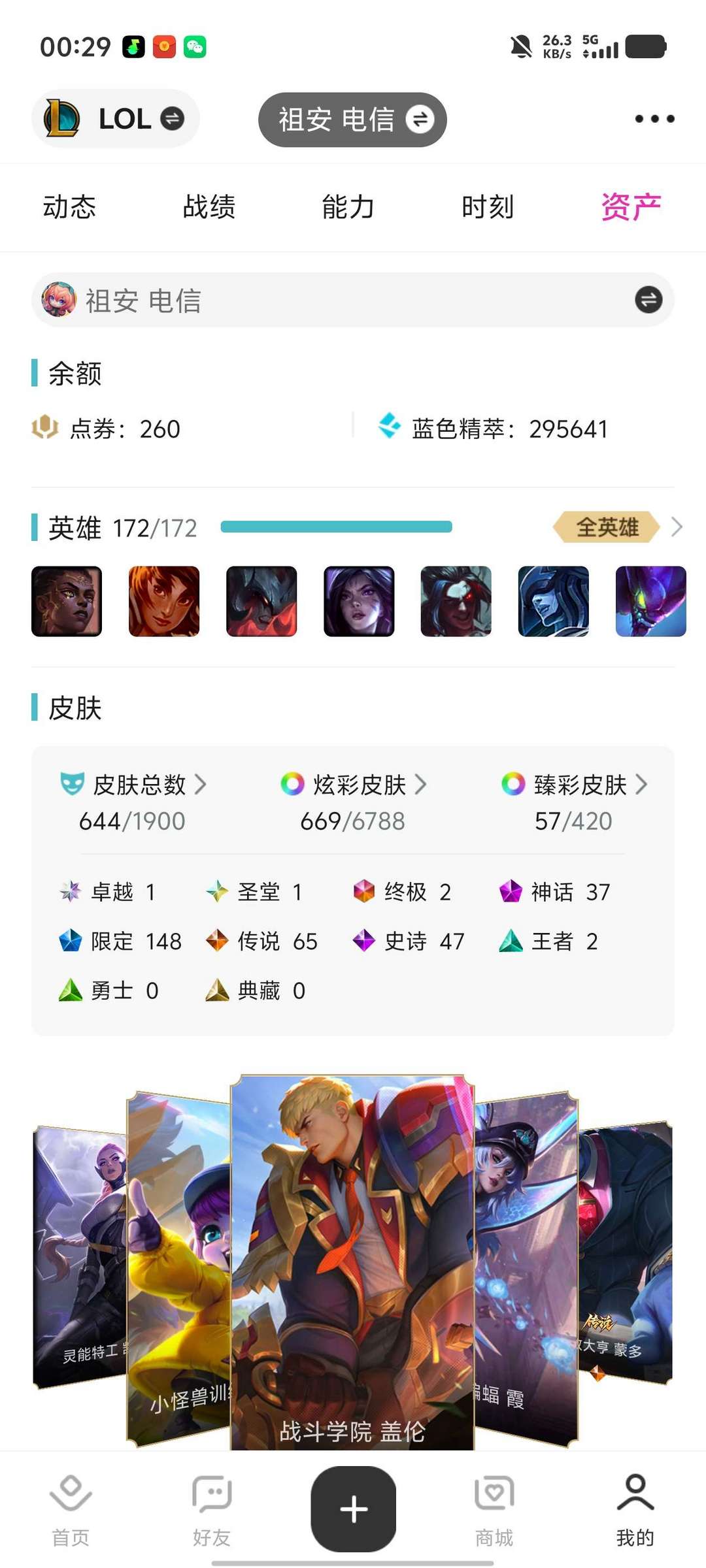 皮肤数量中等,英雄基本齐全,排位不掉段可排