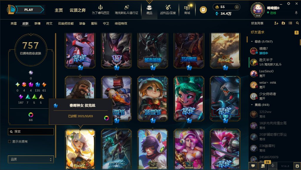 2167皮肤〓可排位妹子号白银〓全英雄〓43神话〓24臻彩275炫彩〓联盟不朽卡莎〓殿堂传奇至臻卡莎