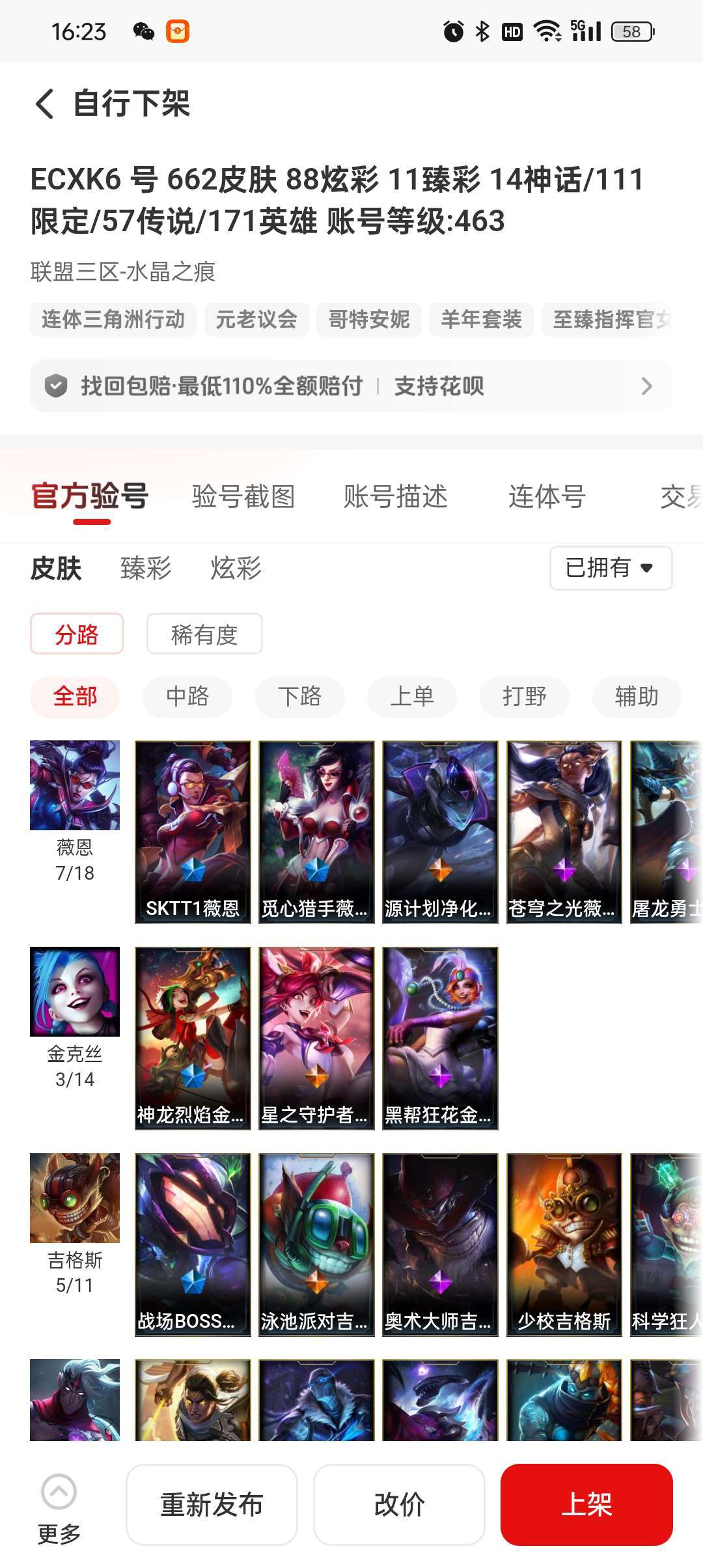 皮肤662英雄171炫彩88臻彩11神话14限定111传说57