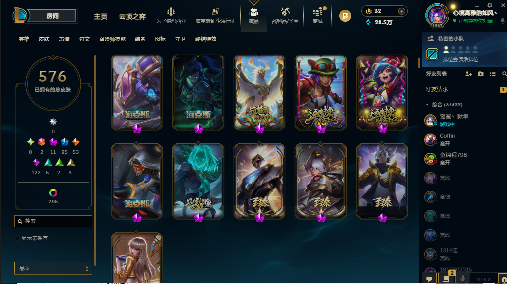 至臻vn、至臻卡莎、至臻ez腕豪瑞文剑魔等等、ad皮肤多
