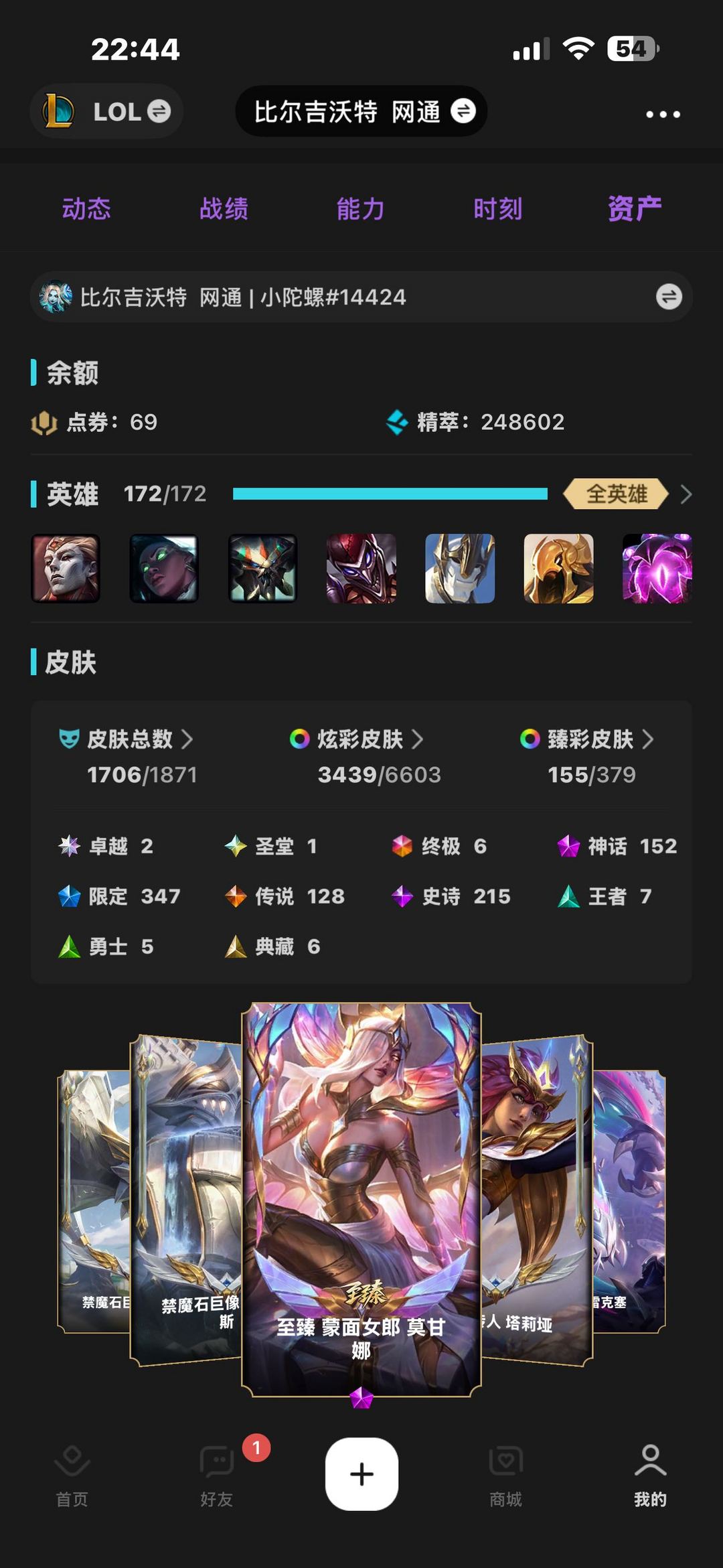 联盟四顶级妹子号1706皮❤️3439炫彩155臻彩⭐️圣堂莫甘娜娜美 神话小小英雄神话棋盘