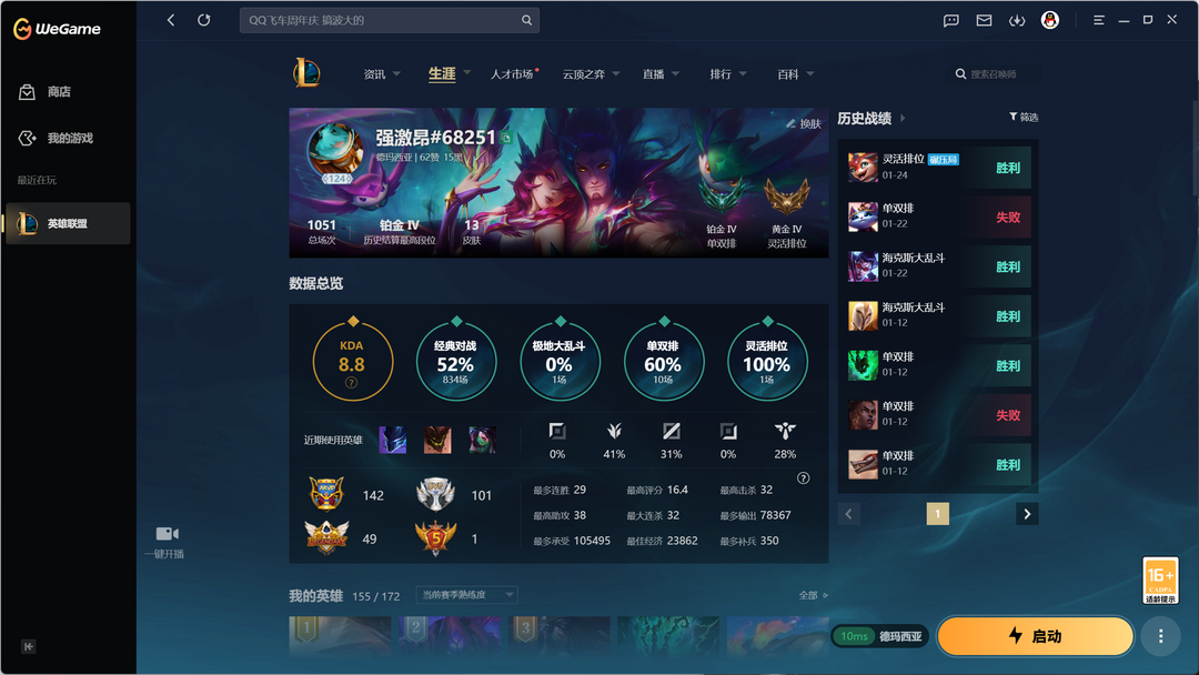 联盟五区·德玛西亚·单双铂金4·灵活黄金4·匹配-乱斗-斗魂低隐藏分(陪玩娱乐精品号)