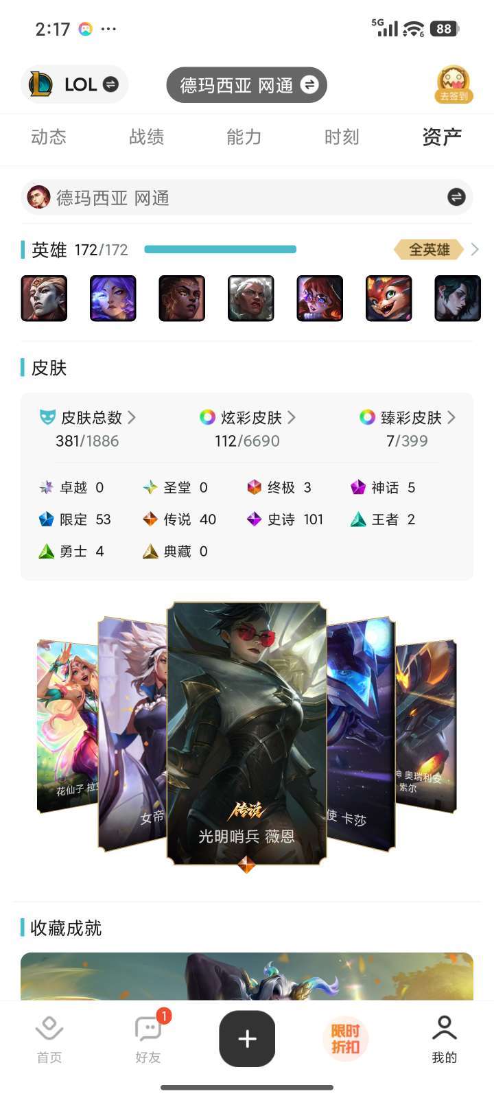 全英雄,271个皮肤,神话11个,很多限定,可以打排位