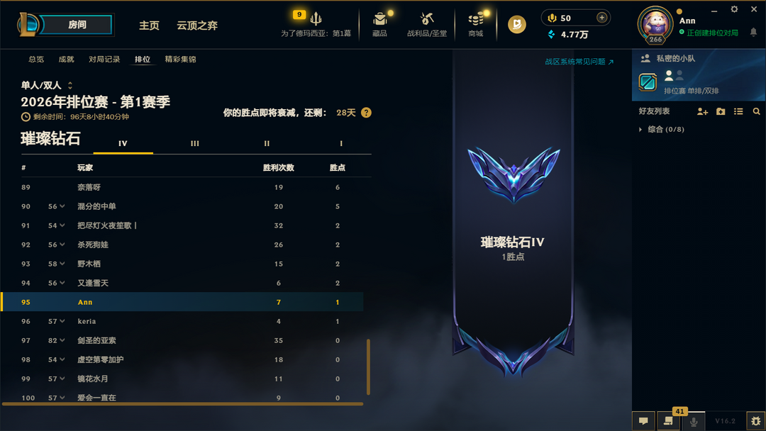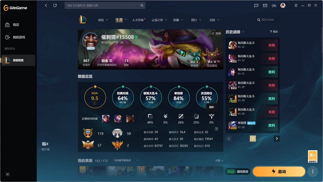 联盟五区·德玛西亚·单双铂金2·灵活黄金3·匹配乱斗斗魂低隐藏分(陪玩娱乐精品号)