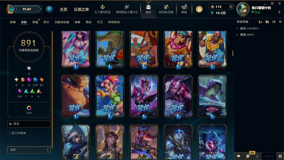 白银龙虾黑夜花木兰嫦娥灌蓝至高游池瞎源计划套大元素虎年蔚鸡年盖伦司马吕布猴年猴子亚索全皮肤劫全皮肤未