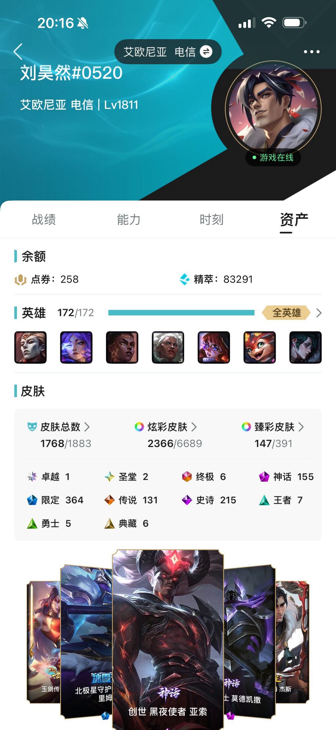 全英雄800皮肤◆龙瞎 9神话 灰烬塞拉斯 至臻 花木兰 黑夜亚索 西部卢锡安 KD卡莎 灌篮高手