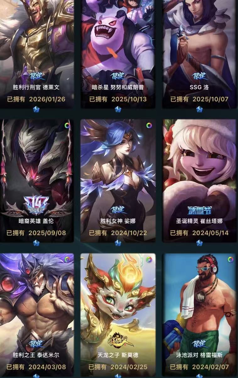 250皮肤!全英雄!龙琴!瞎子皮肤!剑圣皮肤!压缩皮肤!冠军限定!神王德莱厄斯!