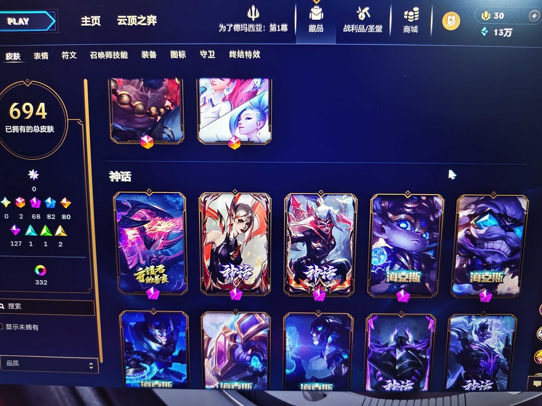 大量至臻传说限定史诗皮肤,可排位,5级荣誉,便宜。