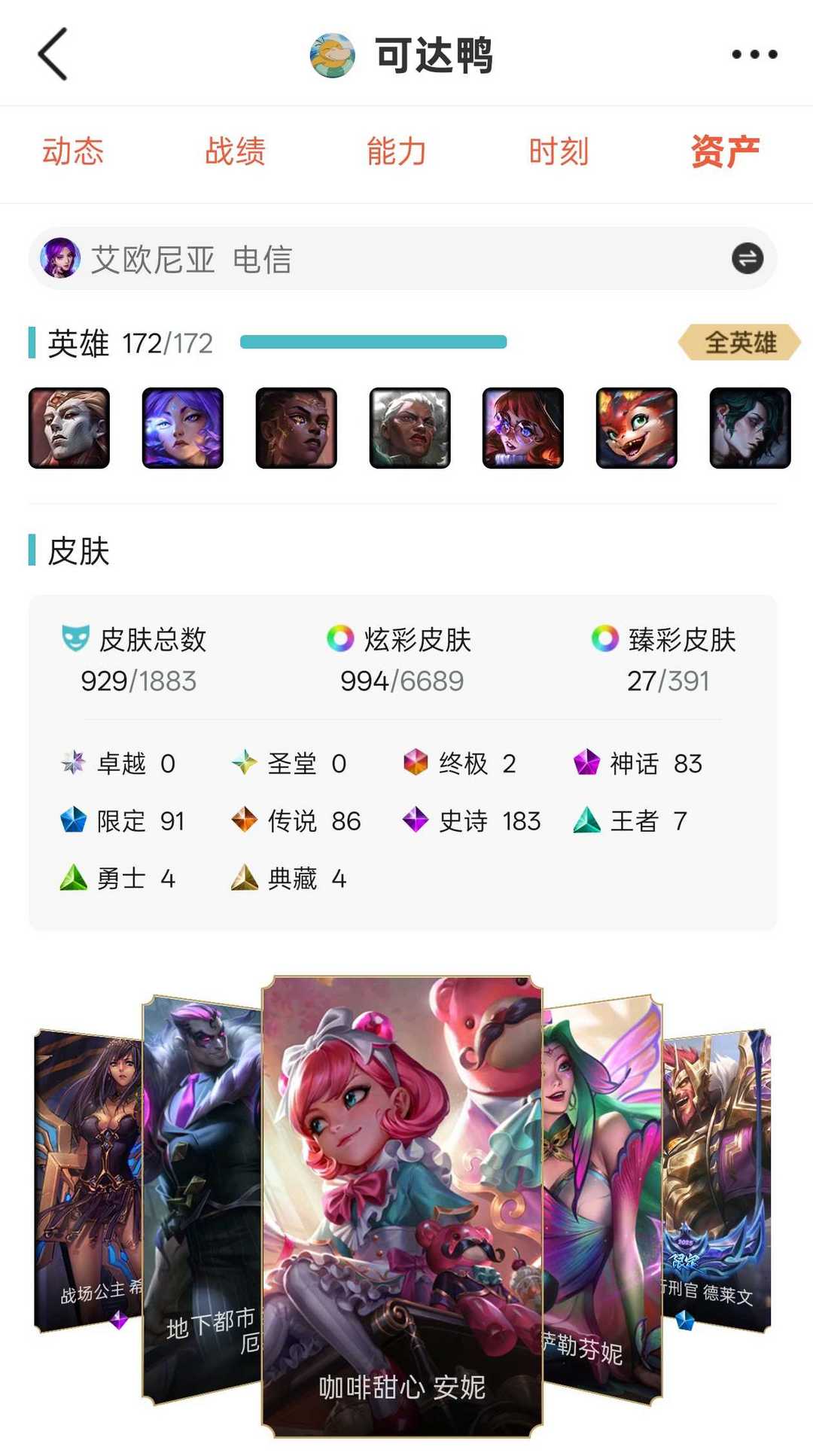 【负胜率排苯蛋】1635皮❤联盟阿狸❤全至臻神话❤全战队大礼包❤负胜率虐菜号1折包天