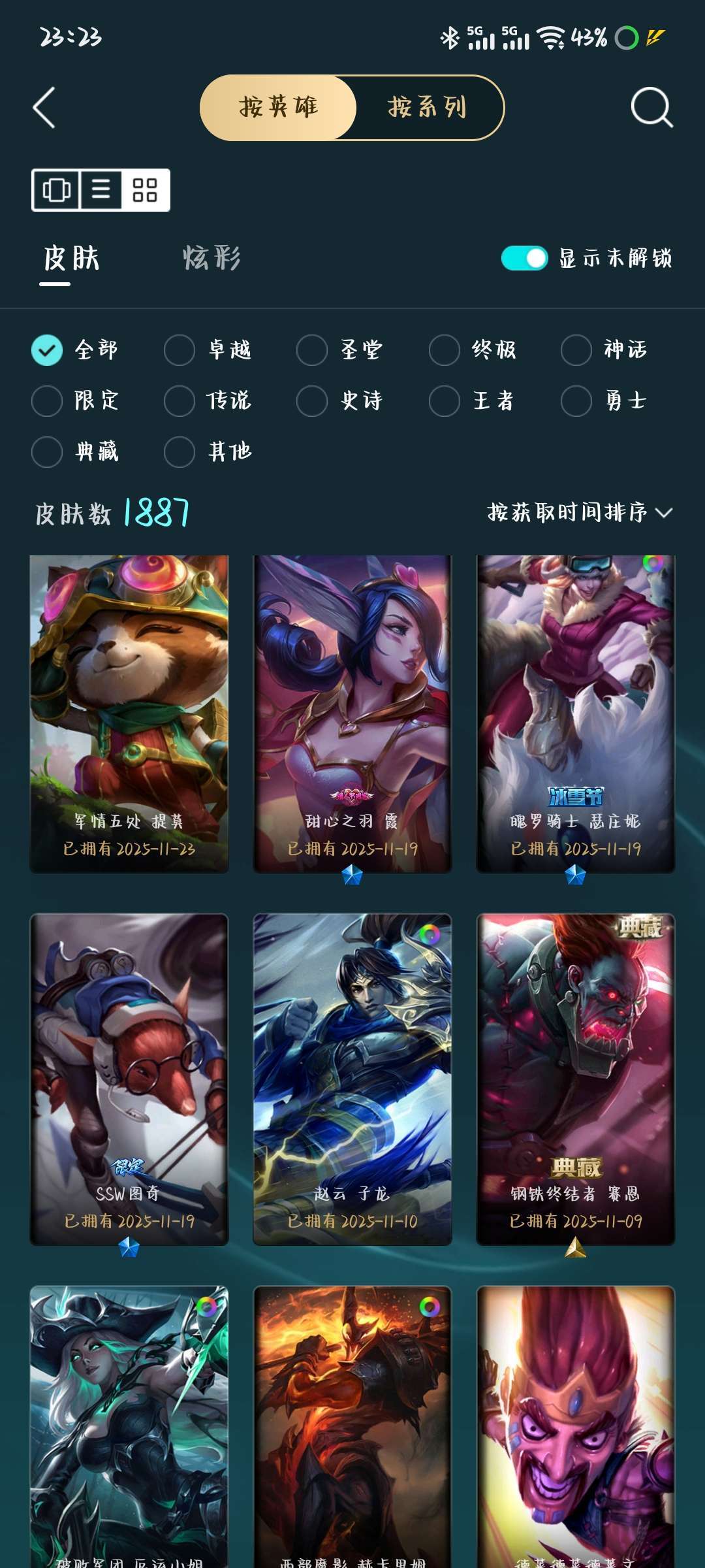 全英雄,上赛季铂金框,单双、灵活均黄金,各种限定皮肤应有尽有