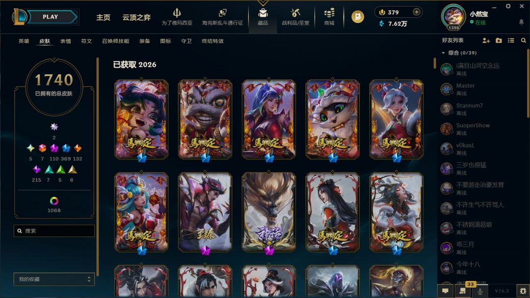 1510皮/1卓越/6终极/50神话/301限定/119传说/龙瞎/冰原女警/神龙李青亚索
