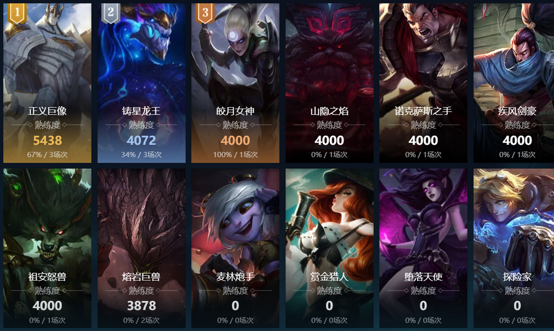 寒冰射手;皮城女警;赏金猎人;黑暗之女;德邦总管;远古恐惧;无极剑圣;牛头酋长;亡灵战神;战争女神;