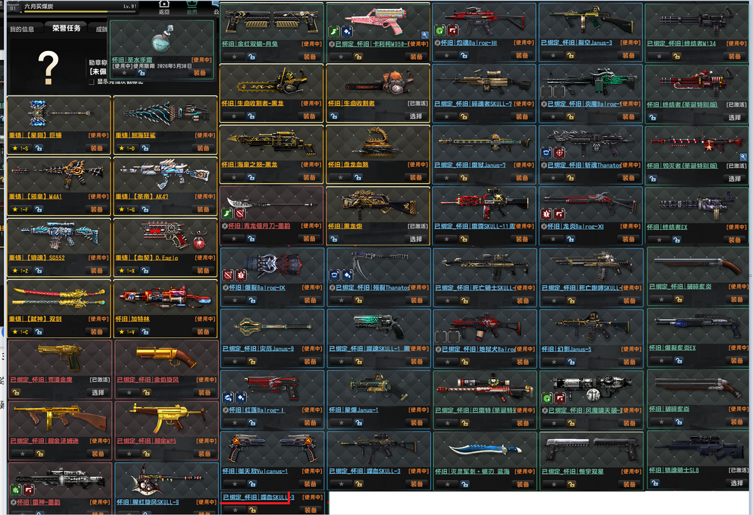 已经去黑雾,怀旧关刀,雷神,重铸弑神双剑怀旧邪皇圣帝,星陨巨锤,电锯,盘龙,圣水手雷。海皇。黑龙炮
