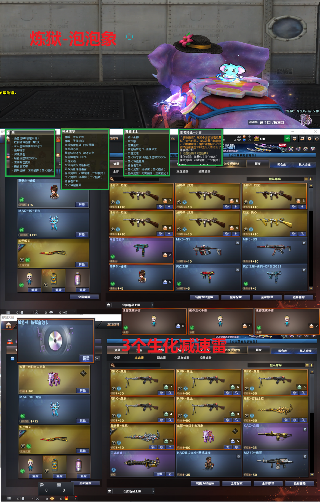 排位:可以、、 -----------------生化四防极品:(更换背包、可以查看生化僵尸血量):无需换弹、6烈6盘、炼狱+音效、炼狱-泡泡象、斯泰尔蝴蝶、异变清道夫、双面神、传说圣灵、死亡之眼、MAC-龙宝、炽芒蝶刃、手斧镜、3个生化减速雷、超级对讲机、全部弹匣、、、、、、、、爆破四防:幻神6皮+音效(KZ、23白鲨、星火小队、N9、冠军之幻、黄忠皮肤)、98K星神、、、、、、USP雷暴、USP冥王、COP堕天神、23白鲨柯尔特、2把冠军之特、COP雪域霜狐、2个USP雷暴王者、G36幻影、FAMAS G2-天戎、白虎、QBZ金色蔷薇、、、幻神音效、裁决音效、白虎音效、炼狱音效、白虎音效、毁灭音效、天罚音效、4套雷暴、1套堕天神、1套夜魔、1套雷霆王者、、、生化四防(神威莲华、毒蝰术士、隼、王者小乔)、爆破四防(鹰、云悠悠、荆棘、王者貂蝉、王者魅影、王者小乔、王者华冠丽服)