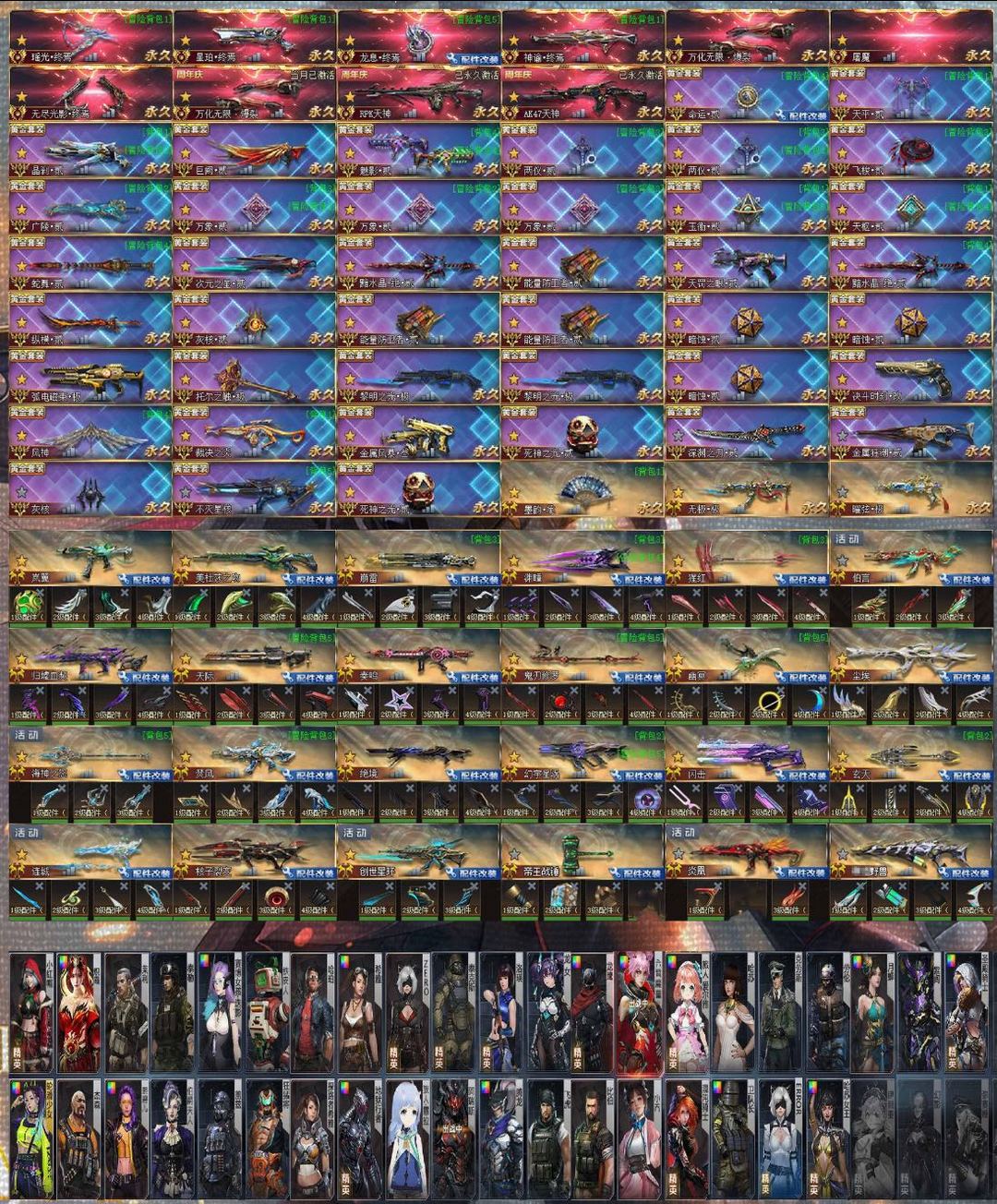 较少极品武器和极品角色,基本枪械都有,自己看吧