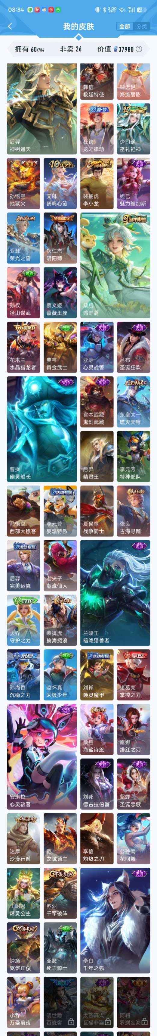 【V7 282皮】128个英雄,284个皮肤,有吕布的荣耀典藏,孙策的时之奇旅公孙离的fmvp.底价出租可打排位