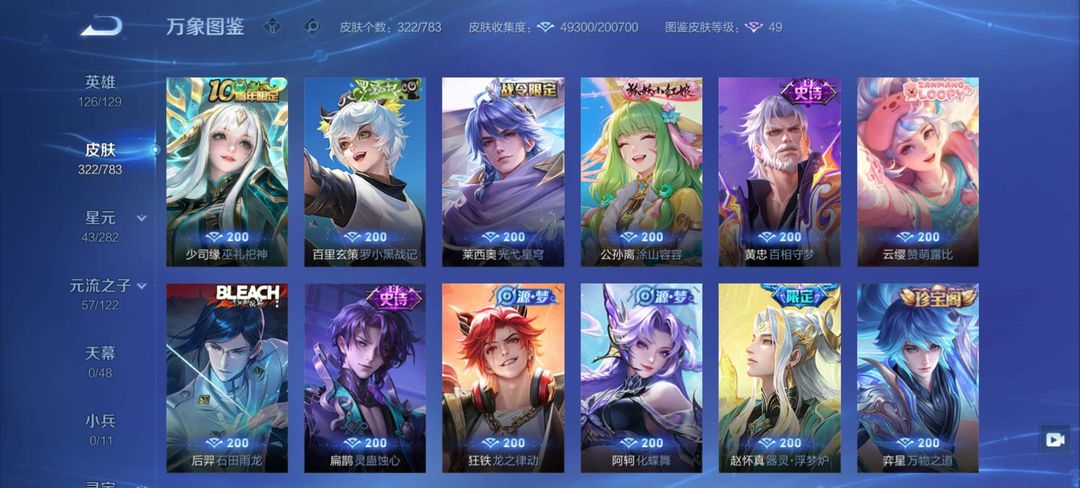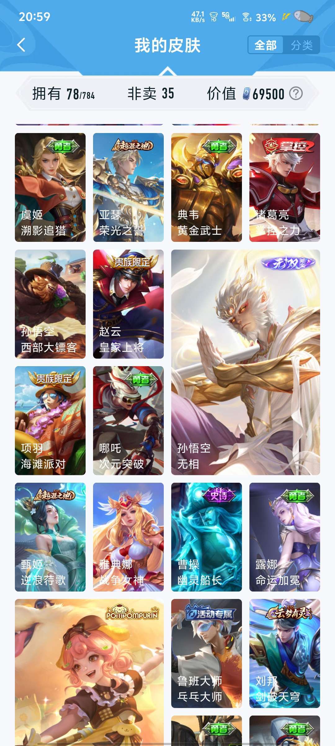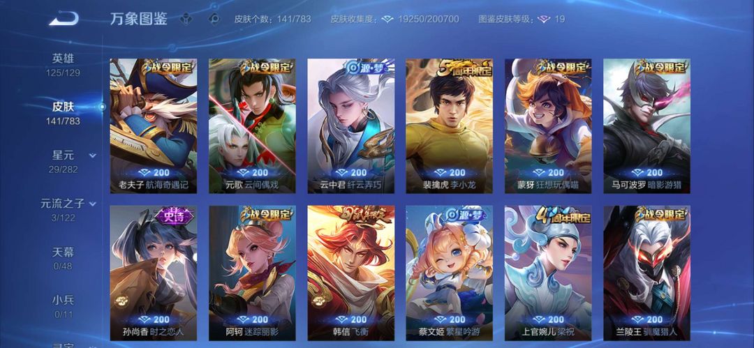 【V7 282皮】128个英雄,284个皮肤,有吕布的荣耀典藏,孙策的时之奇旅公孙离的fmvp.底价出租可打排位