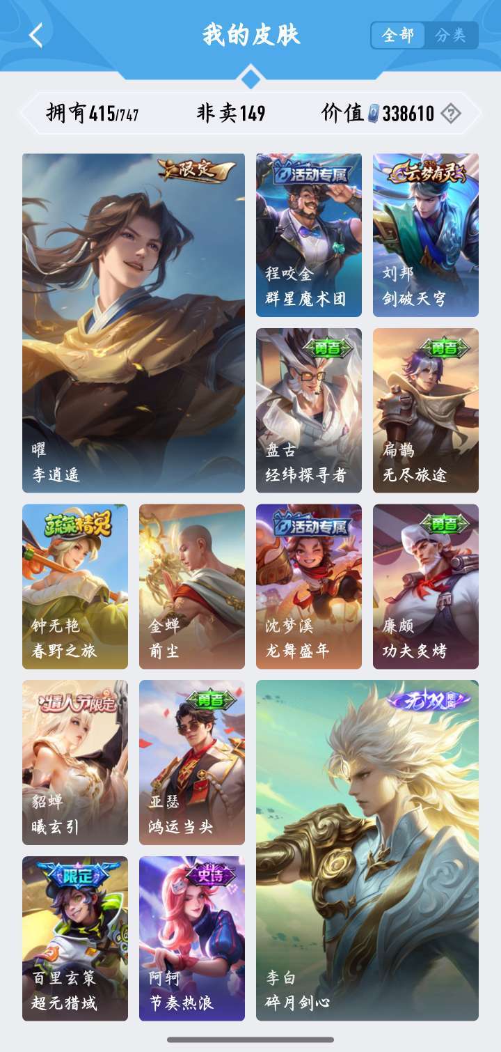 【V6 234皮】耀李白甄姬妲己4无双,4珍品传说,怪盗基德,李逍遥,瀚海游侠,时雨天司,蛇年全套皮肤,至尊宝等限定