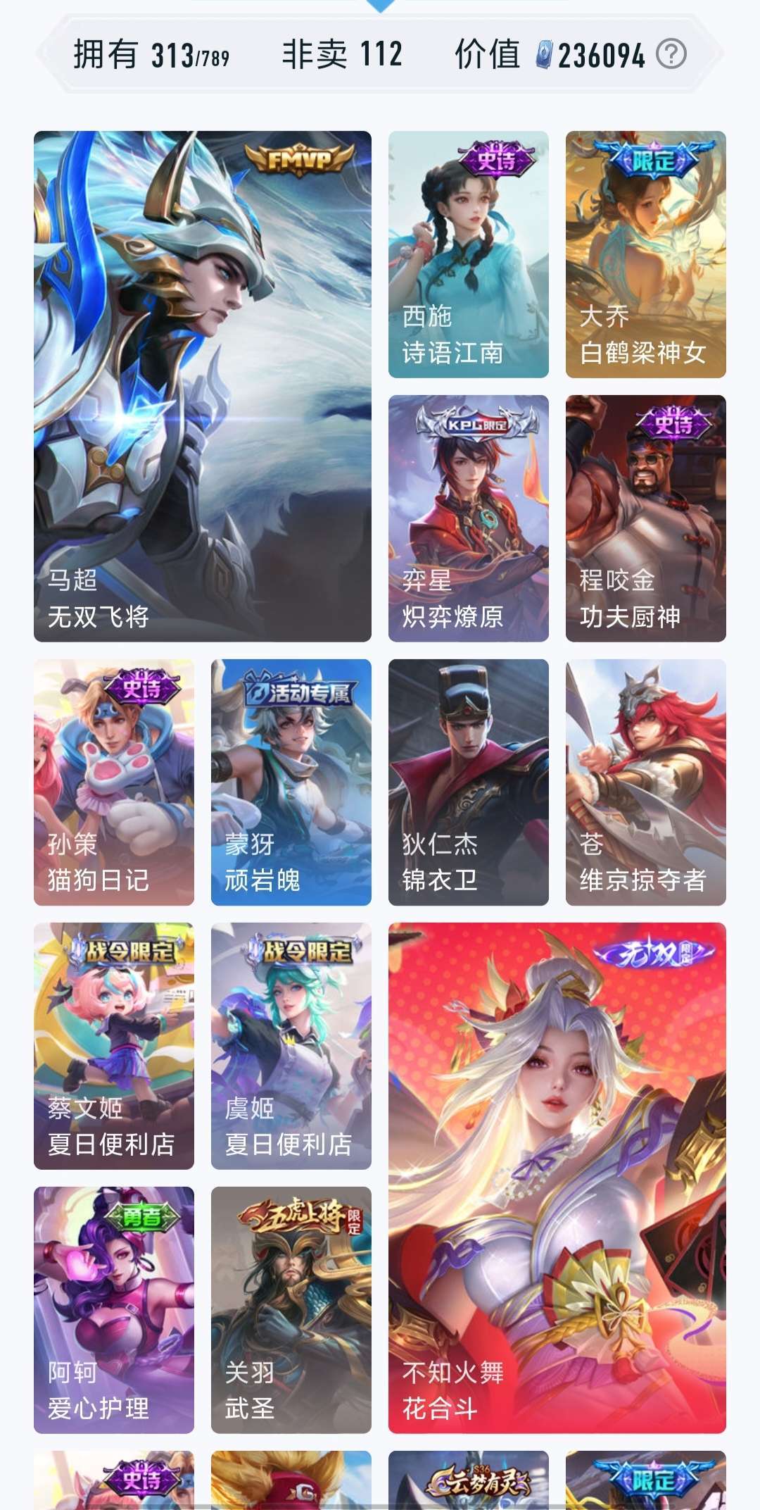 【V10 784皮】安琪拉典藏/李信无双/李元芳星君娄金/马年限定全套/貂蝉馥梦繁花/满珍品/满水晶/满无双/满传说