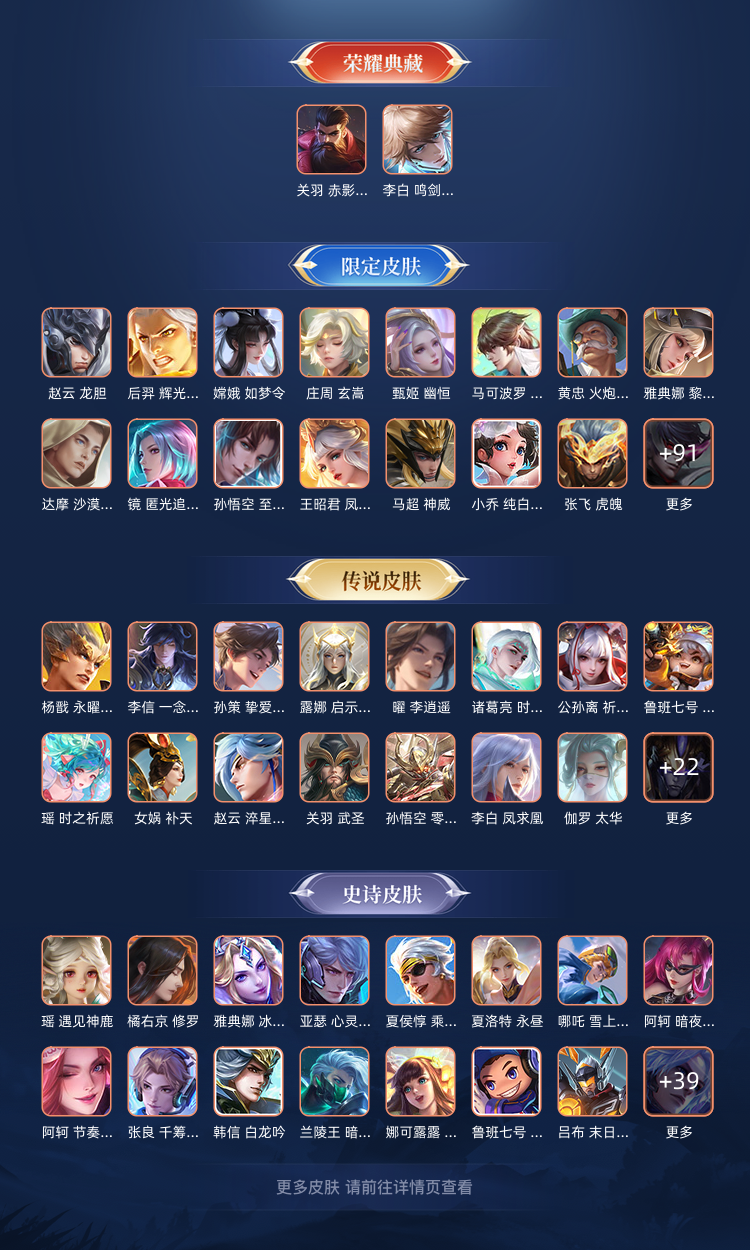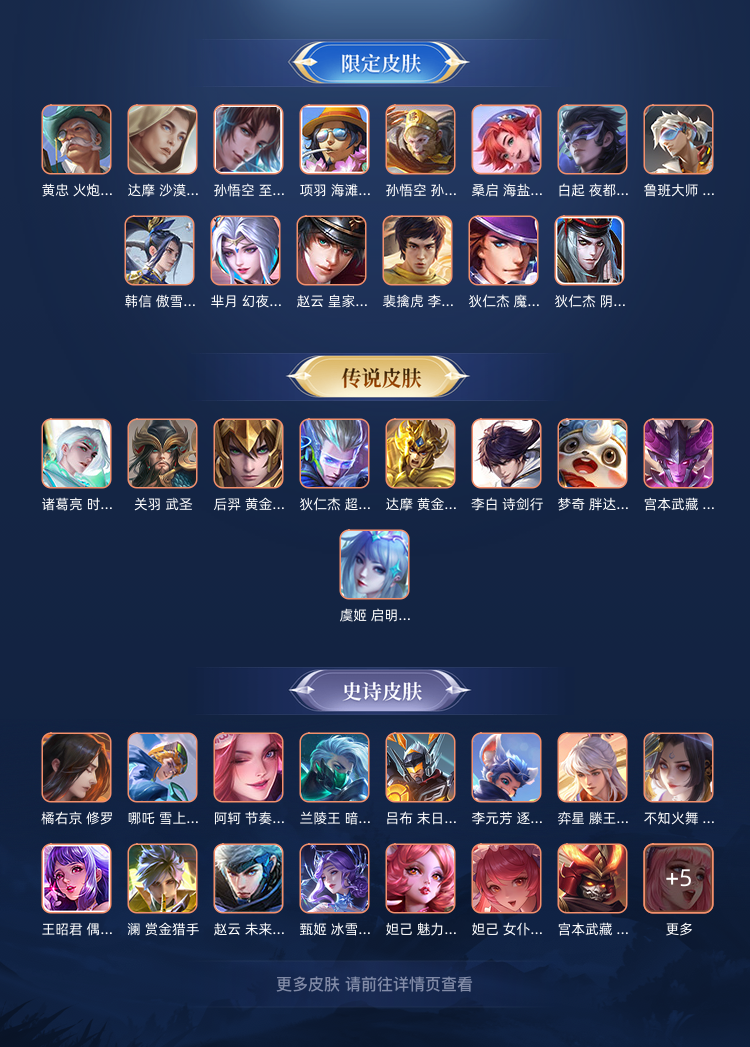 【V10 490皮】(贵族10-490皮肤)包天特惠-65传说皮-35年限皮-李白全皮肤-梅西-白虎志-大乔时之奇旅