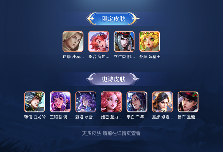 S3赛季狮心王亚瑟皮肤,街头霸王,紫霞仙子,水晶猎龙者,千年之狐等史诗皮肤可以玩。