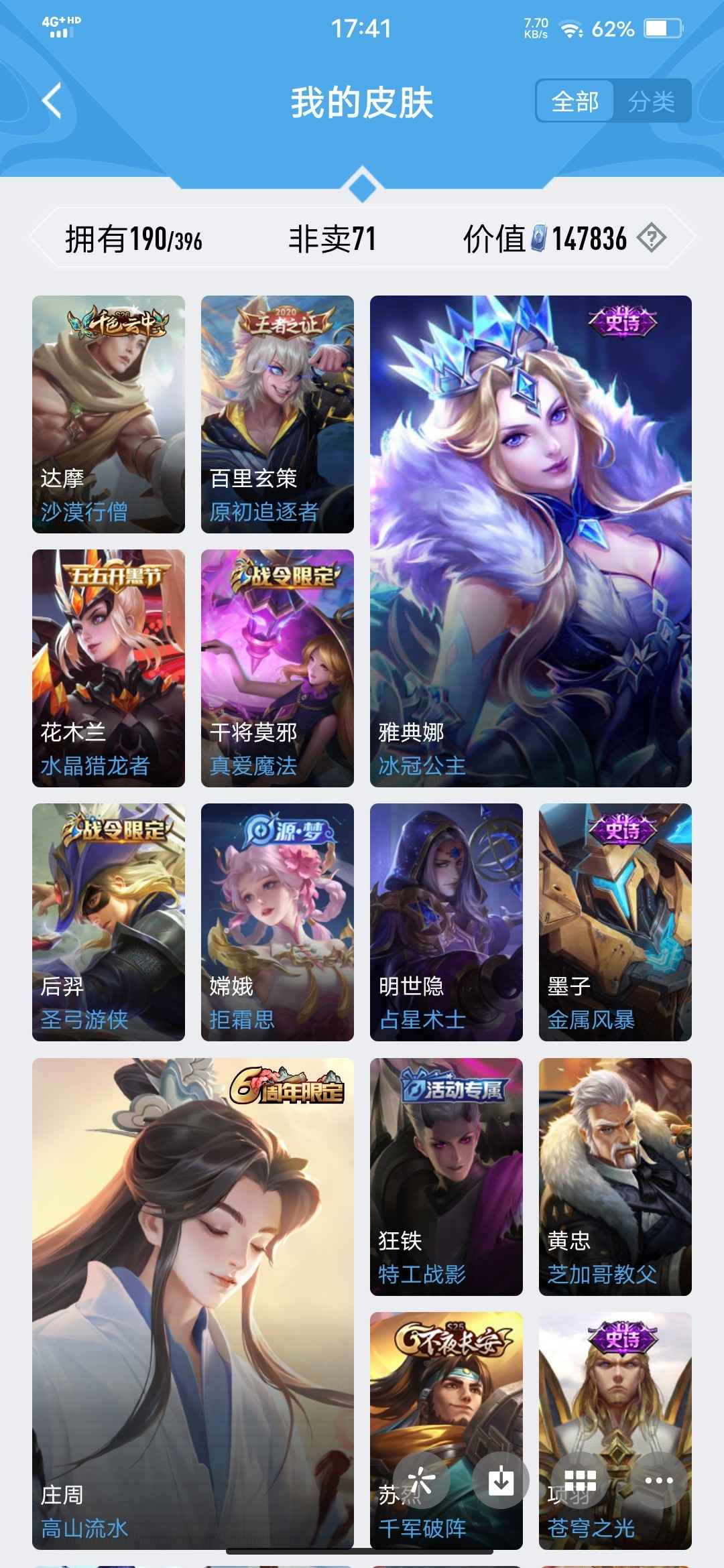 【V10 479皮】263!凯无双已补!10典藏7无双5珍品99传说!可以排位加 品牌:王者荣耀