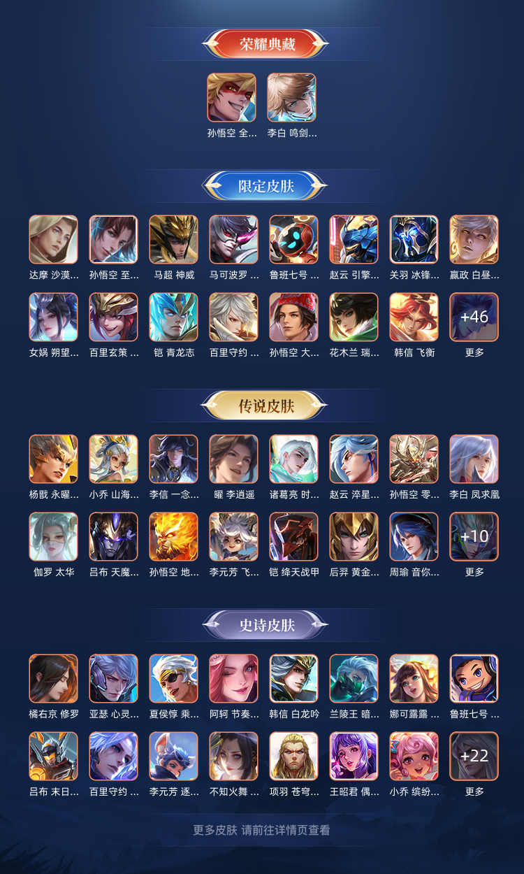 【V7 284皮】【V8 典藏:1 234皮】66段对抗路5个万战11个省标发育路45段打野31段九霄神辉无双飞将炽霜