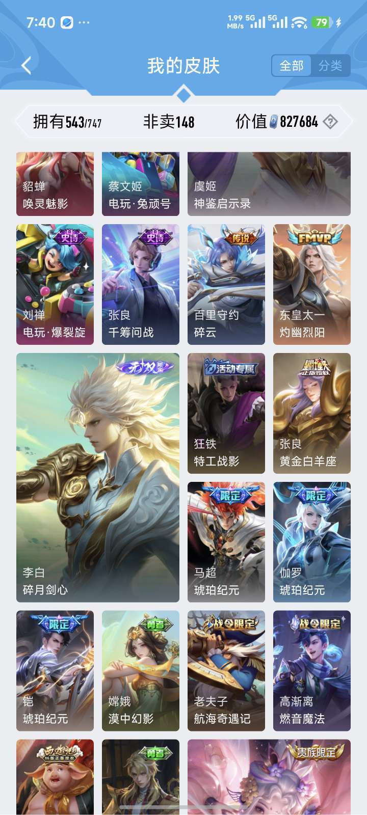 禁言!看描述跟朋友一起玩!【V10 576皮肤】12典藏103传说!碎月剑心青丘九尾落雪白狼曦玄引!