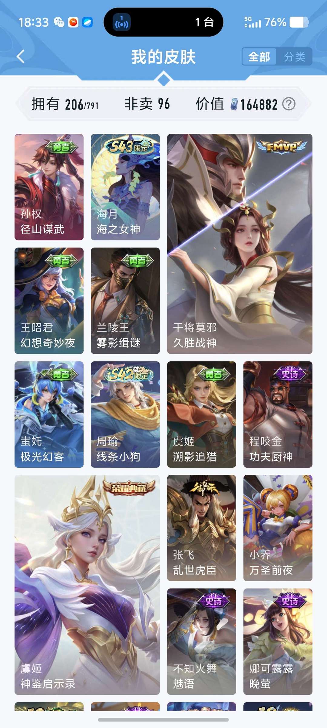 【V9 376皮】全马年限定,海洋之心加天鹅之梦等各种限定级传说皮肤。珍品限定5个,李信猴子曜扉宫本