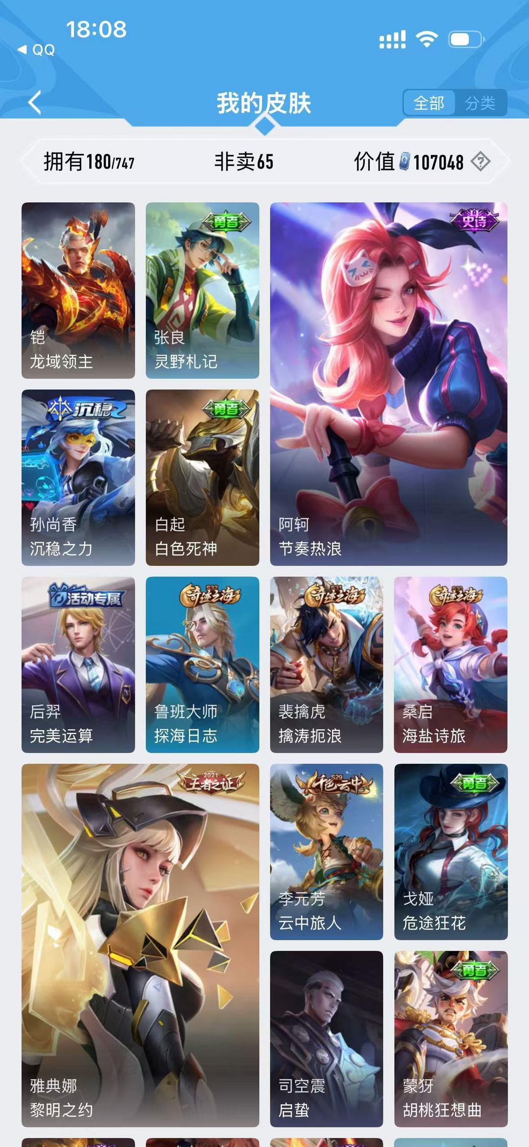 【V10 459皮】300+甄选皮肤/全世冠/时之旅大小乔/月光猴/典藏/龙年限定/可排位/可加好友/全模式可玩