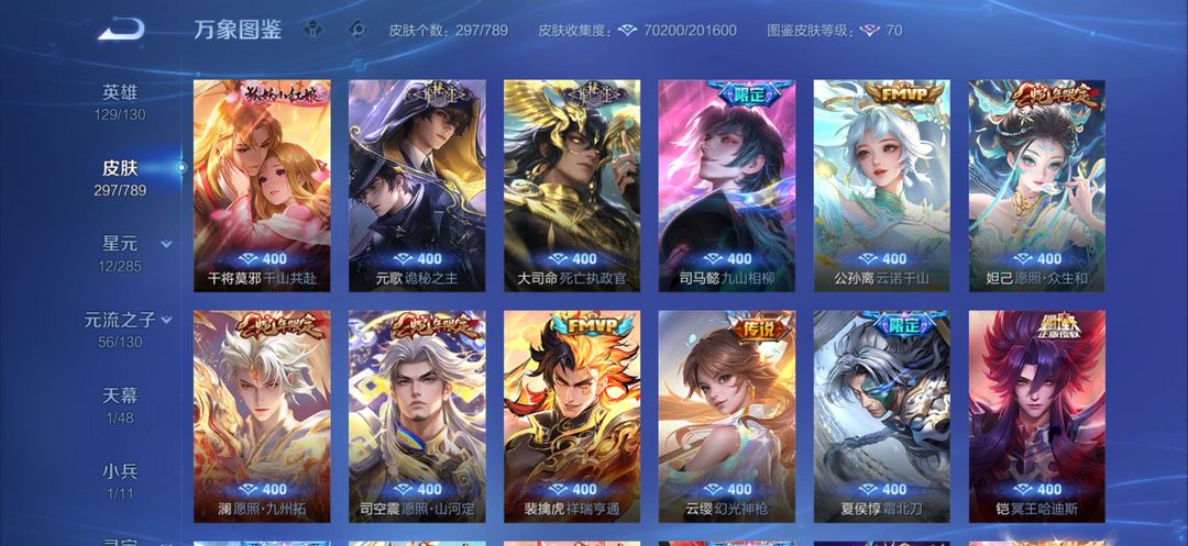 【V10 297皮】孙策小国,芈月狂铁省标,无双五个,珍品传说五个,传说63个,荣耀典藏三个,限定127个全皮肤英雄八个
