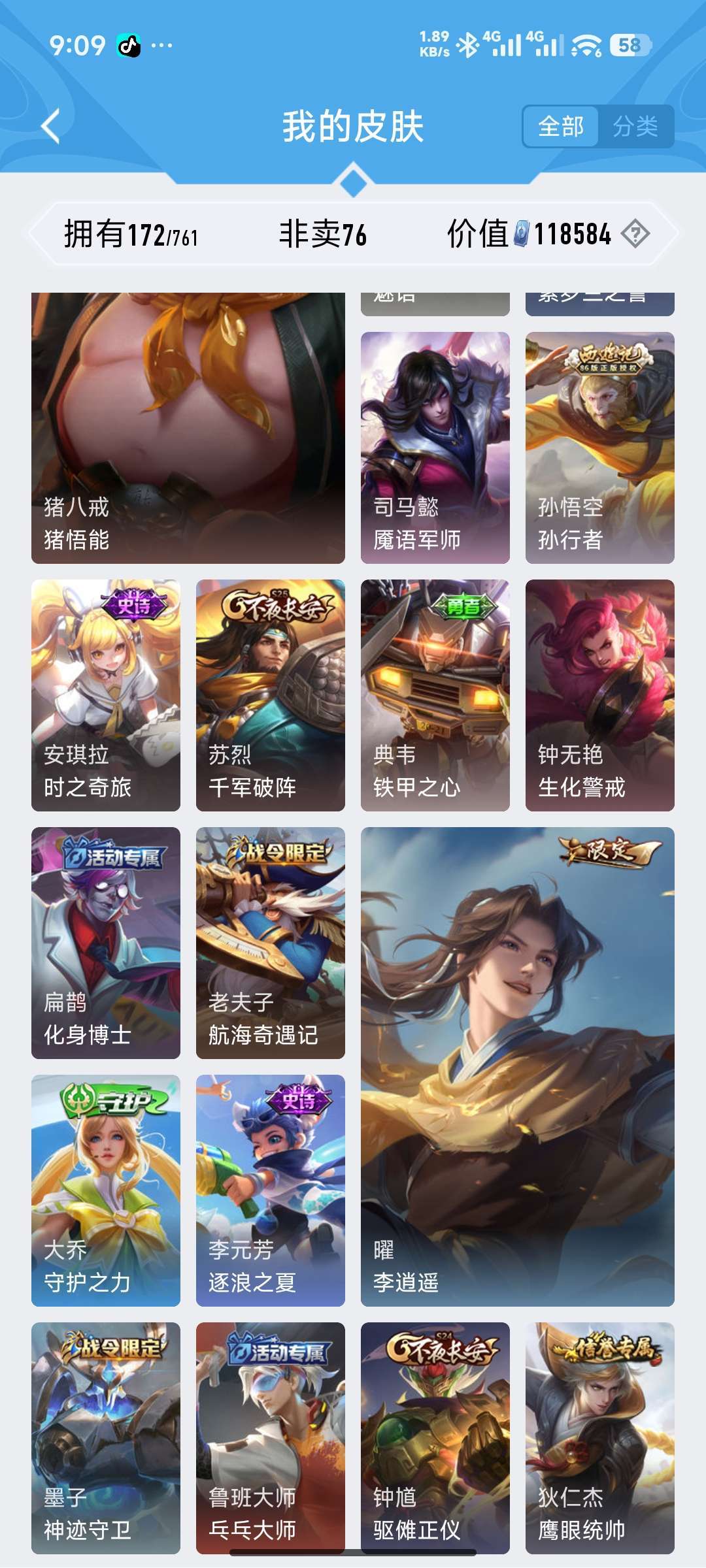 【V4 358皮】韩信无双典藏 李白典藏 基德 至尊宝 幽冥之眼 时雨天司 诸葛亮情限 市标李白诸葛亮