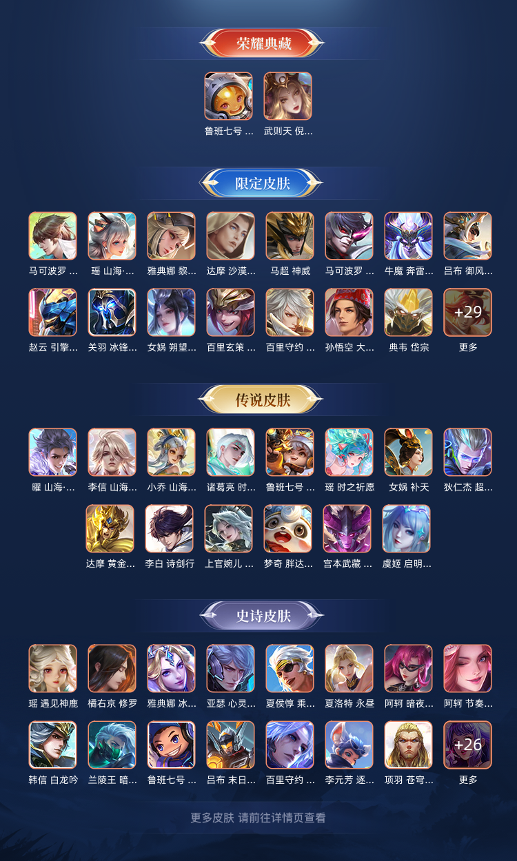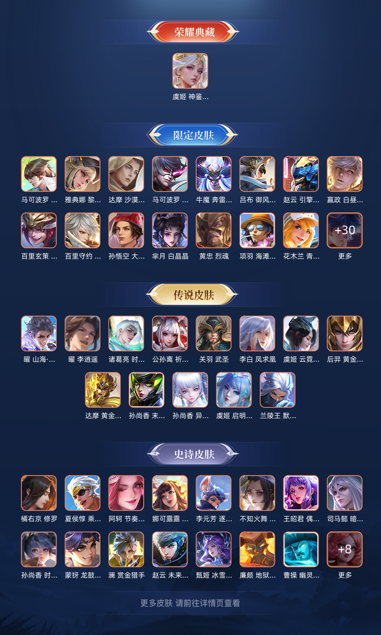 玄策白虎,虞姬限定以及典藏,澜限定个位置均有稀有皮肤,本号现在钻石可炸鱼