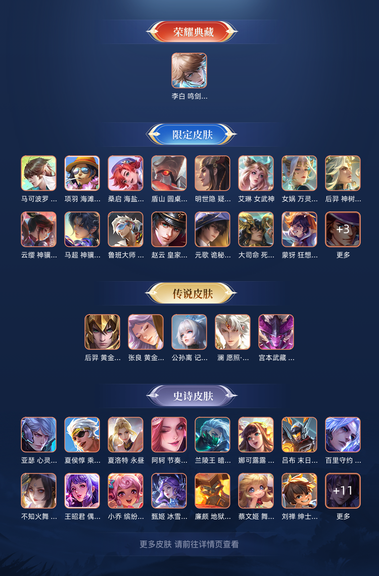 几乎全英雄,几乎全铭文,胜率高,传说皮肤挺多,